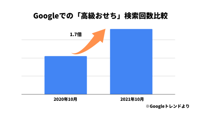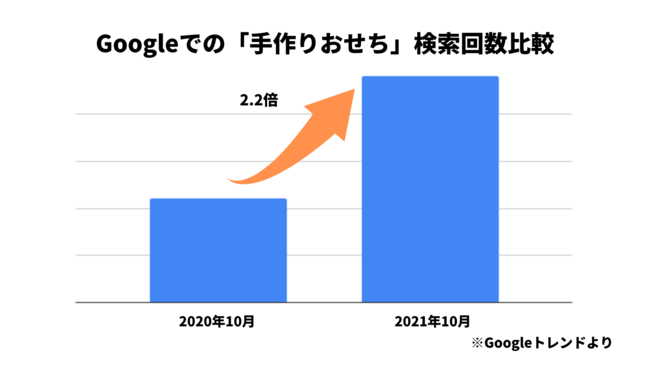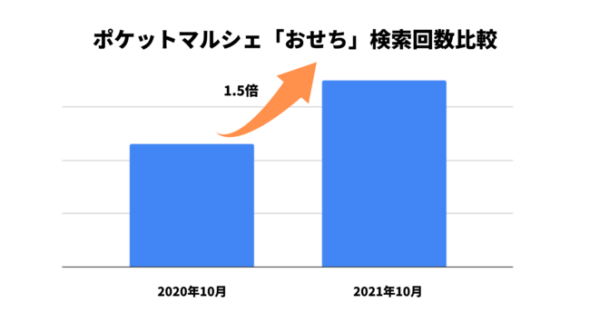 ポケットマルシェ内における「おせち」のキーワード検索回数は、2016年のサービス開始以降、昨年が過去最高となりました。「おせち」の検索回数は、ポケットマルシェ上でも例年10月から増加しはじめ、12月にピークを迎えます。2021年10月の検索回数は前年同月比1.5倍となっていることから、今年の検索数は昨年を上回る可能性があります。コロナ下での認知の広がりをきっかけに、特別な日の料理や食材の購入先として、産直ECが次第に浸透してきていることがうかがえます。また、Googleトレンドの傾向より、ポケットマルシェ上でも「高級おせち」や、「手作りおせち」用の食材に注目が集まることが見込まれます。