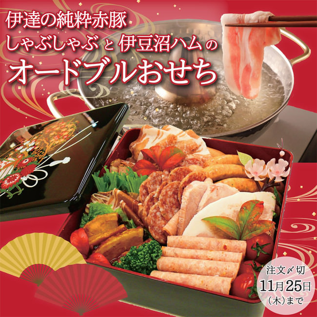 【重箱付き】伊達の純粋赤豚しゃぶしゃぶと伊豆沼ハムのオードブルおせち