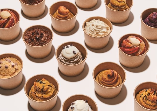 昨今のテイクアウト需要の高まりを受け、新店舗で販売する商品の形態として、一個から気軽に買える「カップスイーツ」を採用しました。過剰包装をなくすだけでなく、パッケージの寸法を統一することで、使用する包装資材を大幅に削減。環境に負荷をかけないしくみづくりを実践します。