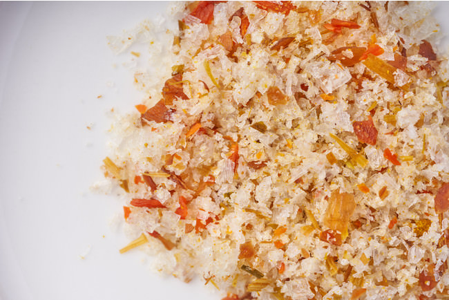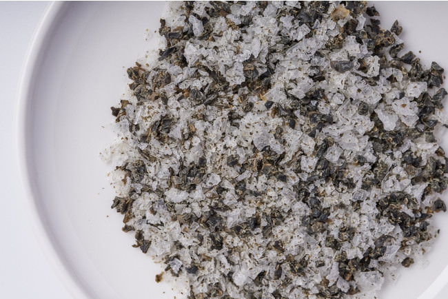 これをベースに、肉料理に使う、肉の骨をベースにしたフォンでは野菜のバランスを強め「野菜塩」を開発いたしました。フランス料理の観点だけではなく、日本料理の観点も採り入れるべく、今春新規開店した「セルリアンタワー数寄屋」「Japanese Cuisine桜丘」においても、“出汁”を活用。出汁を取った後の昆布を同様に乾燥させ粉砕し「昆布塩」が誕生いたしました。