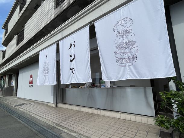 「パンで」は大きなのれんを掲げ外壁をなくしたオープンな外観で、通りがけの人も気軽に立ち寄りコミュニケーションがしやすい店舗です。