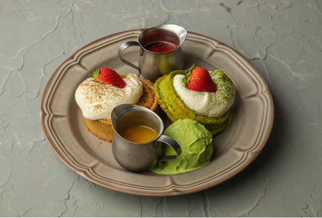 米粉を使ったフワフワ食感と、静岡県産の抹茶・ほうじ茶の茶葉の香りが特徴のkawara CAFEらしい和テイストのパンケーキです。オレンジとベリーの2種類のソースをかければ、お茶の深い香りとマッチしてより爽やかな味わいをお楽しみいただけます。