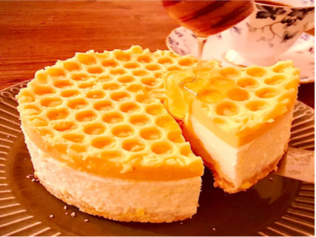 付属の蜂蜜をかける事で、さっぱりとしたレアチーズケーキと蜂蜜のコクがマッチし、バランスの良いレアチーズケーキが完成します。