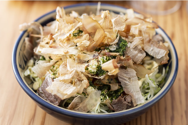 ラム肉とマヨネーズ、ソース、天かす、青のり、かつを節をかけてお召し上がりいただきます。驚きのサラダを初体験してください。