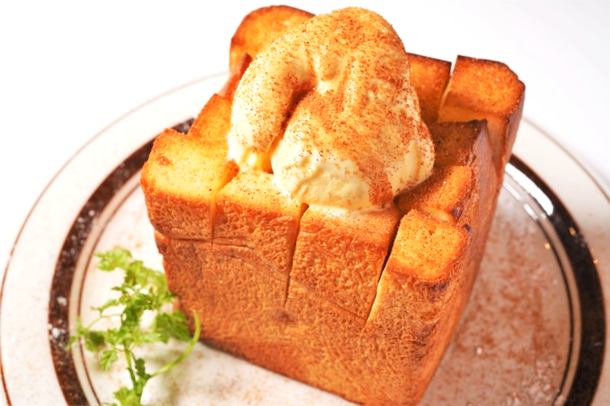 生食パンの自然な甘みにアイスクリームとはちみつの甘さを加えて、3つの甘みが味わえます。低温でじっくりとローストしている為、表面はパリッとした香ばしい食感を楽しめ、自家製の焼き立て生食パンを使っているので中のパンはしっとりとして柔らかく、さらに耳の部分まで柔らかく食べやすいのが特徴で、女性お一人でもペロッと食べきれる美味しさに仕上がりました。
