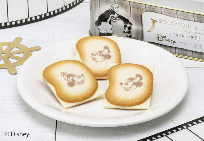 シャリシャリッと軽やかに焼きあげたラングドシャクッキーには、楽しそうな表情のミッキーマウスが描かれています。絵柄は3種類ありますので、どれが出るかはお楽しみ。東京ばな奈が最高のミルキー感を目指して作りあげた“おいしいバナナミルクシェイク味のショコラ”を、はみだすほど大きくサンドしました。かんだとたんお口いっぱいにミルキー感が広がります。