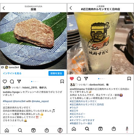 近江焼肉ホルモンすだく日向店が10月29日と30日に開催したレセプションは、SNSフォロワーの方の中から抽選で選び招待を行いました。18:00~と20:00~の時間帯で常時満席の営業でした。すだく日向店社員2名、アルバイトスタッフ20名、すだく本部からの応援2名で営業に臨み、お客様から対面、SNSを通してたくさんの応援や激励の言葉をいただくことが出来ました。