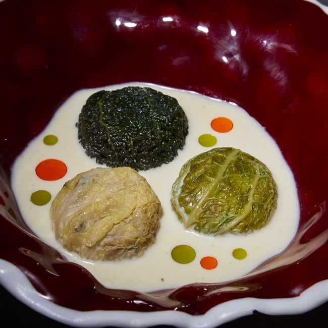 < 京鴨とフォアグラ白味噌仕立てロールキャベツ >