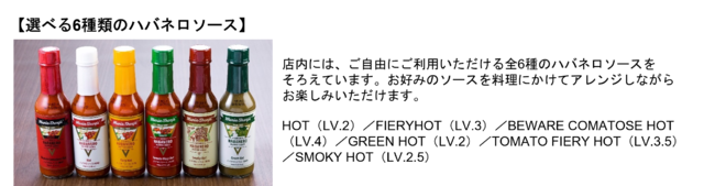 またメキシコ料理に欠かせないハバネロソースは野菜の旨味が程よい酸味が食材の味を引き立てるベーシックな辛さの「HOT」をはじめ、グリーンハバネロとウチワサボテンを使用した「GREEN HOT」、辛い物好きも納得の激辛ハバネロを使用した「BEWARE COMATOSE HOT」など6種類をご用意。お好みのソースをかけ、お食事をアレンジしながらお楽しみいただけます。