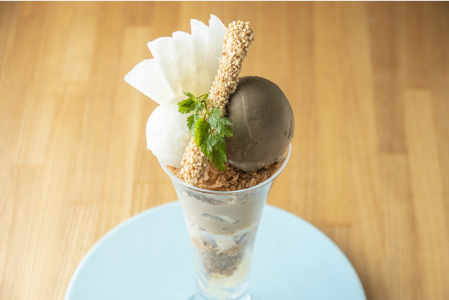 季節のフルーツを使ったパフェをテーマに、和梨をつかったパフェを考案。焙じ茶と梨両方の味を感じられるようにバランスを整え、アーモンドのキャラメリゼや、飾りのバトンマレショーで香ばしさもプラスした一品。