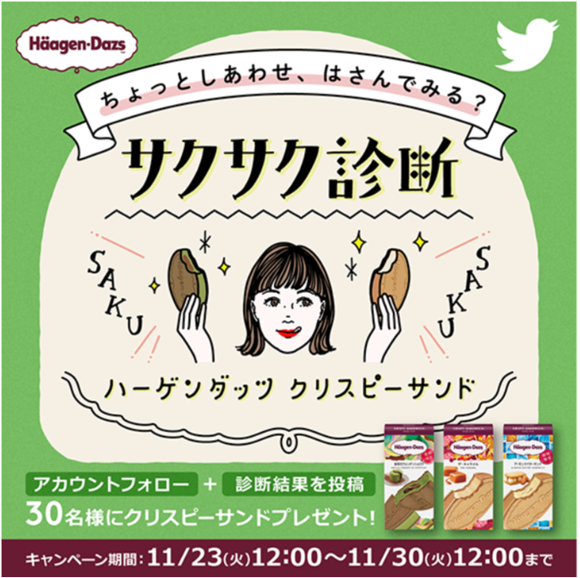 ハーゲンダッツ公式Twitterアカウントをフォローし、診断結果を投稿すると、抽選で30名様にクリスピーサンド3種×4個の詰め合わせセットをプレゼントします。