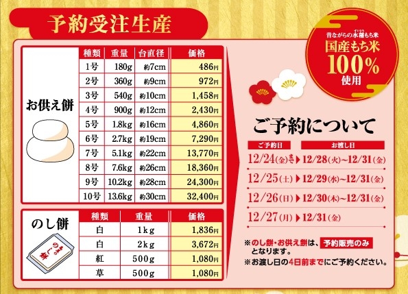こだわりの「杵つき餅」は予約受注生産となり、ご予約承り期間は12月27日(月)までです。