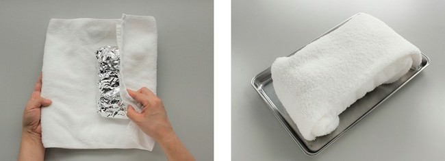 加熱終了後すぐに取り出し、2重にしたアルミホイルで包み、さらにタオルで包んで調理台の上に室温で1時間程度放置。
