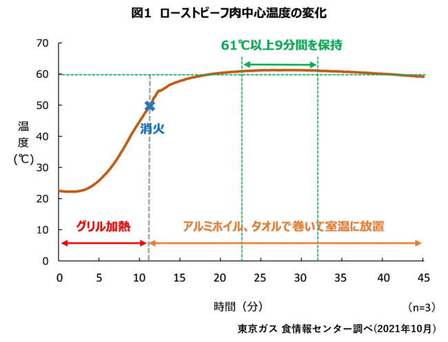 グリルで11分間加熱すると、肉の表面にはよい色に焼き目がついているものの、肉の中心温度は50℃にも満たず、内部まで火が通っていない状態です。しかし、その後、ホイルとタオルで包んで室温にしばらく放置しておくことで、調理開始から32分後に61℃以上9分間の基準(※)をクリアすることが確認できました。(図1)
