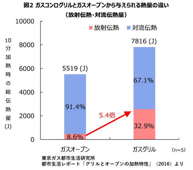 図2の通り、ガスコンロのグリルはオーブンと比較して全体的に熱源から与えられる熱量が多いうえ、食品の焼き色に影響を与える放射伝熱による加熱の割合が高いため、表面の温度が上がりやすく、焼き目を付けるのが得意なのです。