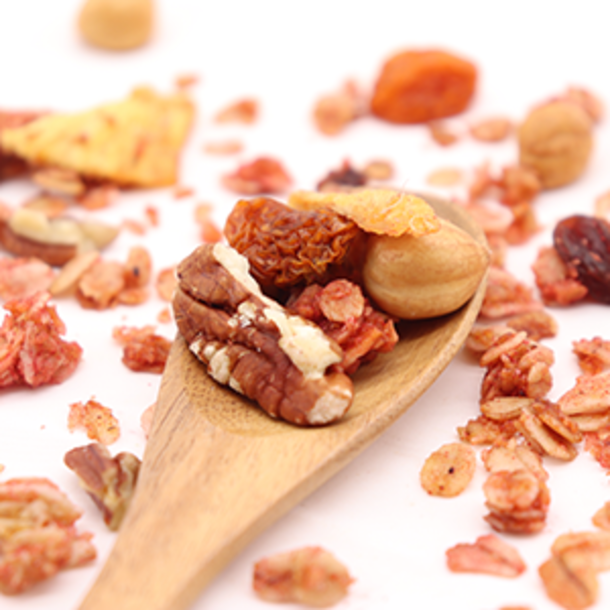 ALTHAUSで1番美肌効果の高いスイート・ノヴェンバー、スーパーフルーツのゴールデンベリー、ハチミツにスイート・ノヴェンバーの香りをつけたスイートノヴェンバーハニーなどを使用。牛乳と混ぜるといちごミルクのような味わいを楽しめる、ピンクの可愛らしいグラノーラです。
