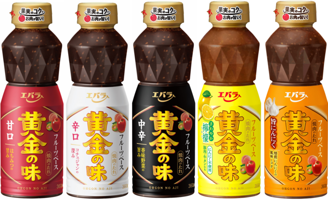 1978 年に発売した「黄金の味」は、原料の約 3分の 1に国産リンゴが使われているフルーツベースの焼肉のたれです。「甘口」「中辛」「辛口」「さわやか檸檬」「旨にんにく」の5つのラインアップでおうち焼肉の楽しさを広げます。また、野菜炒めやチャーハンなど、いつもの料理を手軽にコク増しできる万能調味料としてもお使いいただけます。