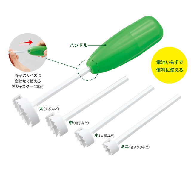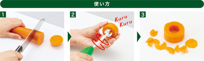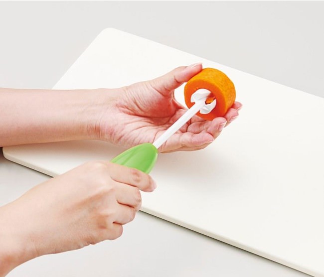 「ベジヌキちゃん」はくるくるまわすだけで、野菜の底を残したままくり抜けるので、映える肉詰め料理を簡単に作れるアイテムとなっております。
