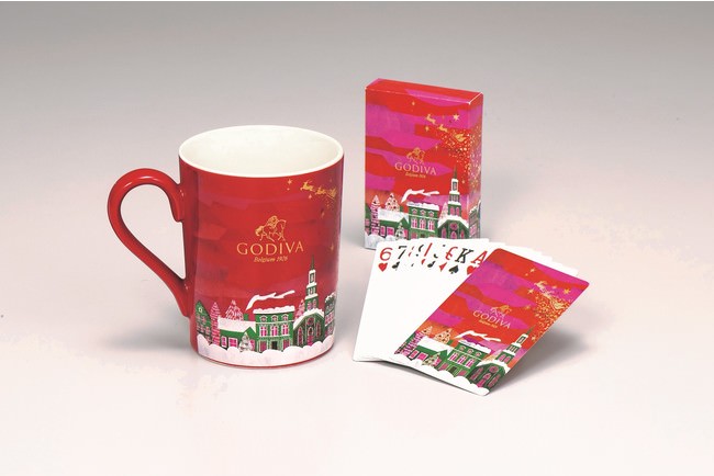 「オリジナル マグカップ&トランプ」は、今年のゴディバのクリスマス限定「キラリ★ときめくクリスマス コレクション」のパッケージにも描かれた、ヨーロッパ風の街並みにサンタクロースが舞い降りる、クリスマスムード漂うデザインをモチーフにしています。