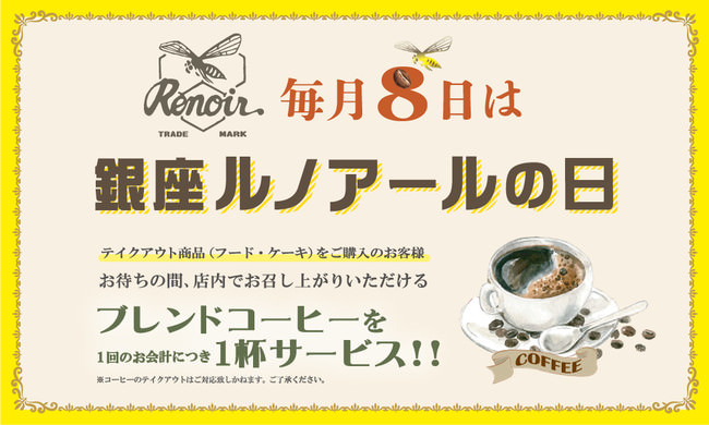 喫茶室ルノアール、Cafeルノアール、Cafe Renoir、Cafe Miyama、瑠乃亜珈琲の店舗にて、12月8日(水)より、毎月8日を『銀座ルノアールの日』として、テイクアウト商品(フード・ケーキ)をご購入のお客様に限り、お待ちの間に、店内でお召し上がりいただけるブレンドコーヒーを1回のお会計につき1杯サービスでご提供いたします。この機会に是非ご利用ください!