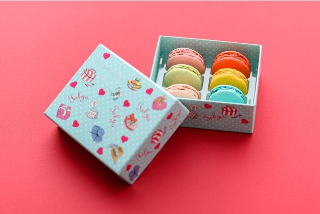 ティータイムやショッピングなど、東京でのおしゃれな時間が描かれている心躍るデザイン。お好きなマカロン6個を詰め合わせできます。