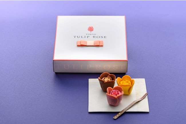 綺麗なラングドシャクッキーで細工したチューリップの中に、とけろけるホイップショコラでローズを咲かせました。ベリー、パッションマンゴー、キャラメルナッツの三つのお味。