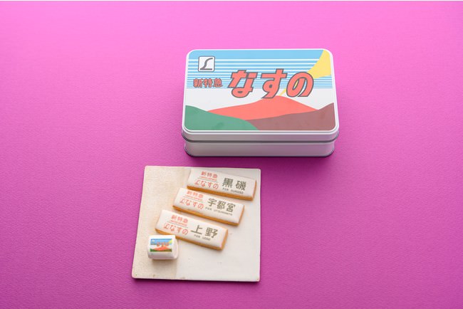 今年3月に定期運行を終了した185系のメモリアルイヤー商品。懐かしのヘッドマーク缶の中には行先表示をプリントしたアイシングクッキーとヘッドマークをあしらったマシュマロが入っています。
