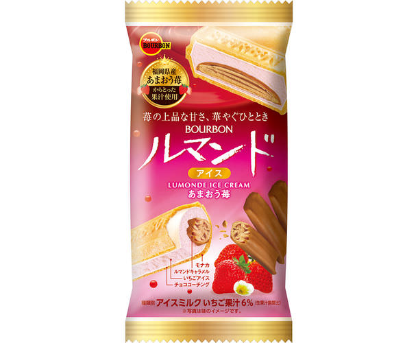 いちごアイスに、キャラメル味のミニタイプの“ルマンド”を丸ごと入れたモナカアイスです。アイスクリームとホワイトチョココーチングを組み合わせることで、甘酸っぱいいちごの味わいとまろやかなミルク感がとけあうおいしさに仕上げました。上品な甘さのいちごアイスにキャラメル味のルマンドがアクセントとなる贅沢な余韻をお楽しみいただけます。