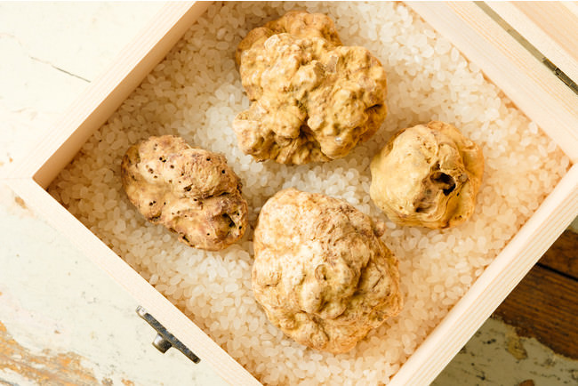 白トリュフの収穫できる時期は1年で主に9月下旬~12月の僅か数か月ほどで、その年の天候や土壌の状況によって、トリュフの状態や、採集量が変動するため市場価格も大きく変動します。手に入れるのも非常に難しく、元来の香りは非常に強いのですがその香りが消失するのも早く、その取り扱いが難しいことも含め、数あるトリュフの中でも群を抜いて特別な存在となっております。