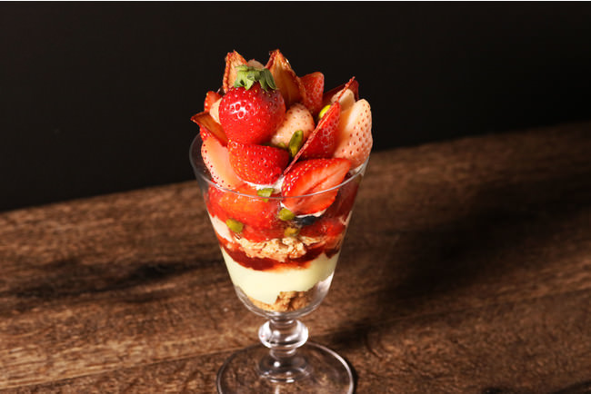 紅白のいちごとヴァニラアイス、フロマージュブランのコクが重なる贅沢なパルフェ。