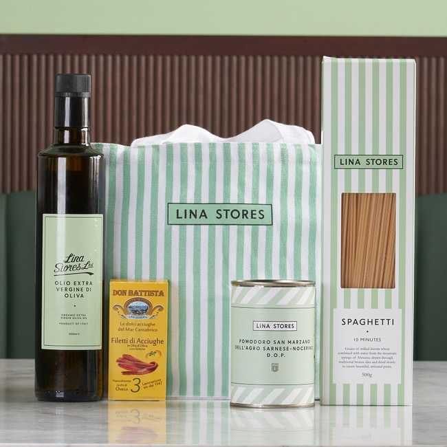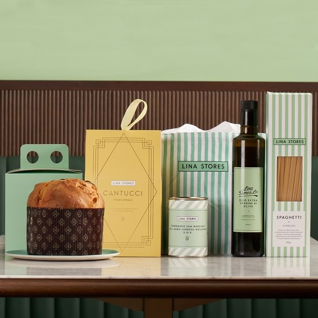 リナストアズの伝統的なパネトーネ、シチリア産エキストラバージンオリーブオイル、美味しいイタリアンビスケット、上質なドライパスタ、イタリアの最高級トマトであるサンマルツァーノトマトのDOP缶など、リナストアズの商品の中から厳選したアイテムを詰め合わせました。