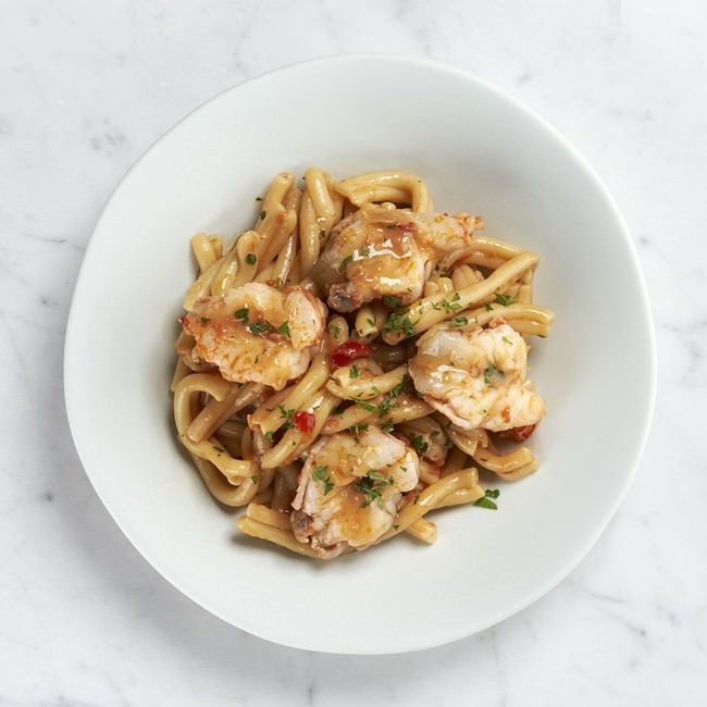 カサレッチェとは、直訳すると「自家製」という意味で、シチリア島発祥の短くねじれたチューブ状のパスタのこと。カラブリア産の唐辛子とシーフードの旨みが凝縮されたスパイシートマトソースに、風味豊かな海老を組み合わせました。パスタにソースがたっぷりと絡み、濃厚な味わいが楽しめます。