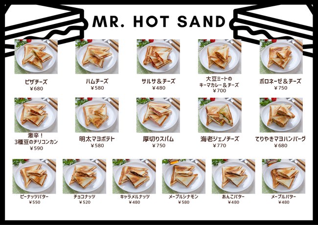 ポークやベーコンを挟んだ満足感のある食事系のものから、小腹が空いた時に食べたいメープルバターサンド・あんこバターサンドなどのデザートホットサンドのメニューもあります。