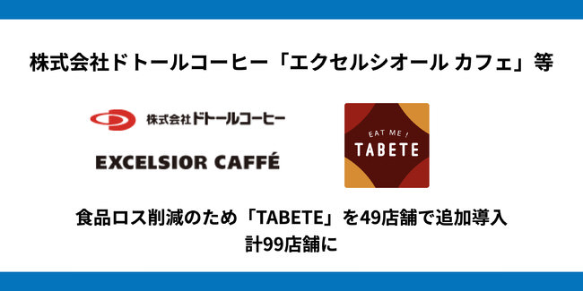 株式会社コークッキングの展開する食品ロス削減のためのフードシェアリングサービス「TABETE(タベテ)」が、株式会社ドトールコーヒーが運営する「エクセルシオール カフェ」等99店舗に導入されることが決定いたしました。同社は2021年8月より50店舗でTABETEを導入していましたが、食品ロスの削減効果が充分に計測できたため、49店舗の追加導入が決定いたしました。