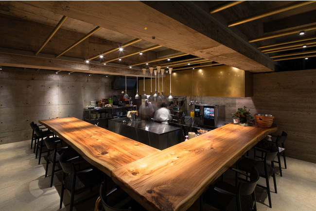 またサステナブルな考えは、安土桃山時代の土をリサイクルしてつくられた店内の壁や、地産地消を考えた国産杉のカウンター、QRコードのメニューなど細部に至っています。