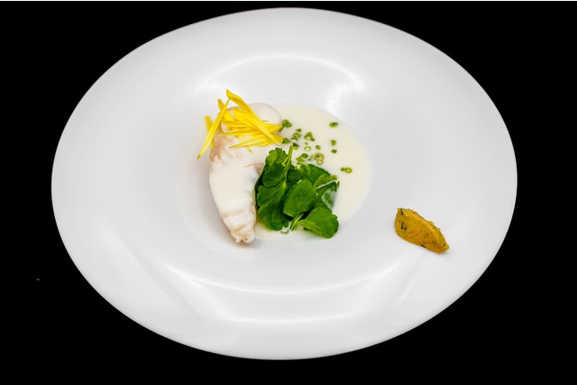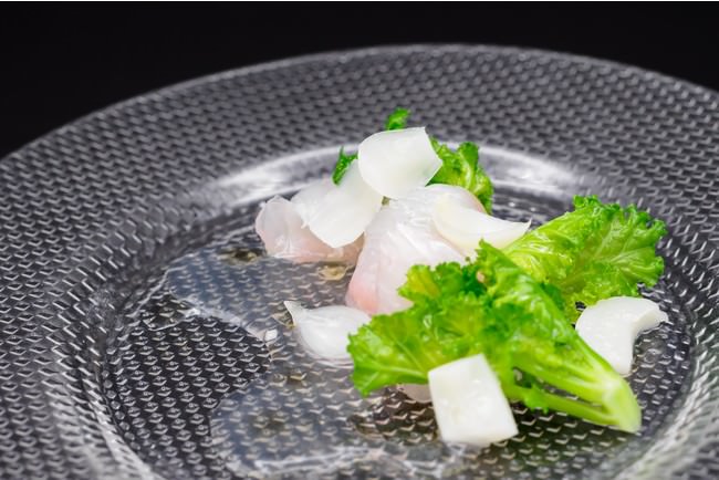 かぶの甘いソースとシャキシャキとした食感のセリ、アクセントに黄柚子味噌を添えて、クエ鍋をイメージした仕上がりになっております。