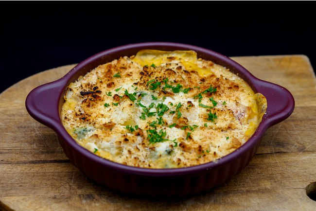 オマールの殻から取ったソースとホワイトクリームを使用し、ロブスターと白子、野菜の入った濃厚なグラタンをご用意いたしました。