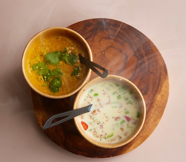 ⼈参やセロリ、パクチーなどの香りに特徴のある野菜とカシューナッツなどを⼀緒に煮込んだイエロースープにさらにターメリックやクミンなどの4種のスパイスを加え、マイルドなカレー仕立てに。