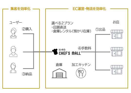 受注管理、在庫棚卸、保管、配送作業などを一括してアウトソースできる預かり在庫型「らくらくECお任せプラン」は、人手不足やECノウハウ不足など飲食店が抱える課題に対応し、これまで通り実来店にも注力しながら店外収益機会を創出する新たなECモデルです。お店にとっては、商品をまとめて倉庫に預けるだけで面倒な注文管理や配送作業の手間が省け、消費者にとっては、気になるシェフや好みのレストランの味を1回の配送でまとめて注文することができます。