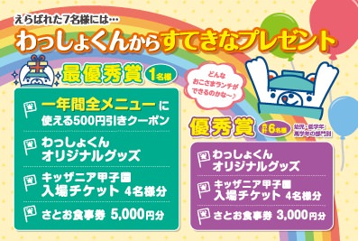 応募作品の中から最優秀賞1名様と優秀賞6名様を選考し、受賞者には、「さとお食事券」や「キッザニア甲子園入場チケット」などの素敵な賞品をプレゼントさせて頂きます。