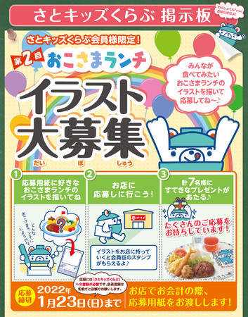 国内206店舗を展開する和食ファミリーレストラン「和食さと」では、本日12月6日(月)より、さとキッズくらぶ限定企画として、おこさまランチのイラストを募集するコンテスト企画を開催します。