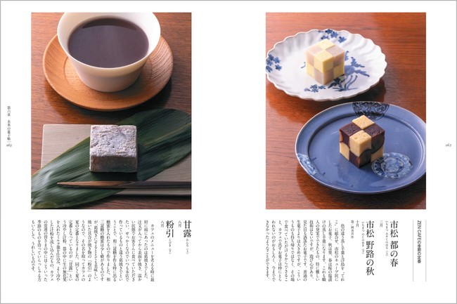 また、顧客や舞妓さんに出前で届けるための「くづきり」用器を信玄弁当の型を模して螺鈿で仕上げた逸品など、黒田辰秋の秀作を所蔵。当代は2021年1月、菓子文化が育んだ美の世界に触れられる場所をと、小さな美術館ZENBIを開館させます。近くには2012年オープンのZENCAFEもあり、ここではテイクアウトではなくその場で食べられる「できたて和菓子」をイメージした甘味が提供されます。また、ここZENBIや知人のギャラリーで個展をするアーティストをイメージした「お誂え菓子」制作など、当代が手掛ける鍵善ならではの新しい世界観も、本書で詳しくご紹介しています。