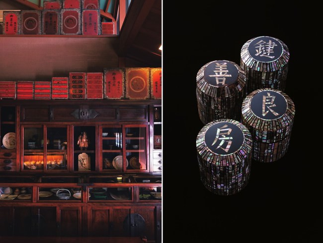 著者の叔父にあたる鍵善12代目・今西善造氏は、柳宗悦らの民藝運動の芸術家との親交が深く、ここ鍵善には木漆工芸の黒田辰秋の作品がとりわけ多く残されています。本店を入った者の目を奪う対の荘厳な飾り棚。当時のお金で家一軒の普請代だったという価値のあるものでした。