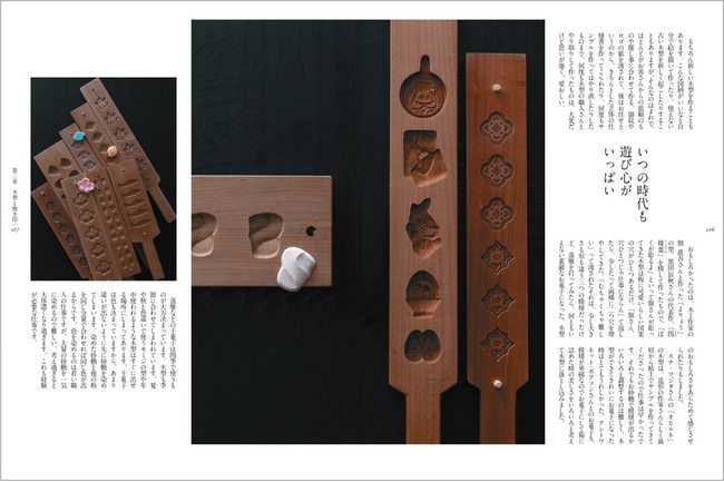 和菓子は手作りのものですが、それを作る木型もまた手作り。今や職人さんが激減している世界ですが本書では木型の美に触れるページも。菓子屋の宝とされる木型は干菓子はもちろん、主菓子の型など大小さまざま、菓子が愛された時代を映す鏡でもあります。ことに鍵善の看板菓子のひとつ「菊寿糖」は小さな花にいったいいくつの花弁が彫られているのか気が遠くなるほどの至芸で、NHK・BS『美の壺 和菓子スペシャル』(11月20日放送)でもこの木型を新たに彫上げる木型職人が登場しました。