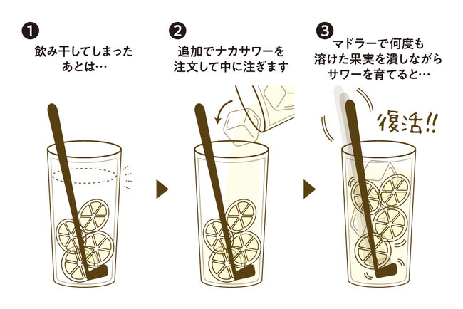 飲みほしてしまったあとは、追加ナカサワーを注文してグラスに注ぎ、マドラーで溶けた果実を潰しながらサワーを育てるとガチサワーが復活!