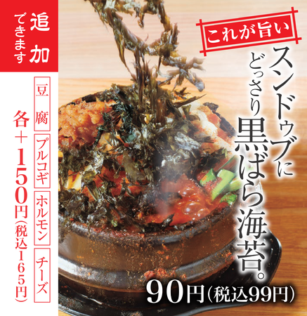 おかわり無料のご飯は、まずは大海老スンドゥブをおかずとして、次にお鍋にご飯と温泉たまごを加えると、まろやかな「おじや」風に。また、プルコギ/ホルモン/チーズ/豆腐を各種165円や新しく仲間入りした「黒ばら海苔」99円を追加すれば、自分だけのオリジナルスンドゥブが楽しめます。
