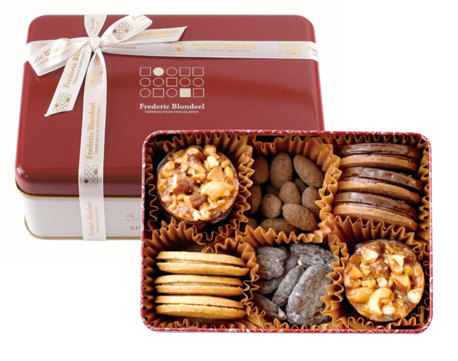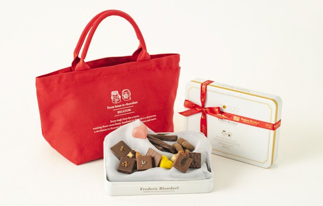 真っ赤なリボンをほどき、純白の缶を開けると、〈プラリネ〉〈ミニタブレット〉〈ドラジェ〉〈オレンジピール〉がずらりと勢揃い。情熱と愛情を込めつくり上げられた個性豊かなショコラの数々が、魅惑のフレデリック・ブロンディールの世界へと誘(いざな)います。バレンタインにふさわしい赤色の特製トートバッグはアフターユースもできる、なんとも嬉しいノベルティ。