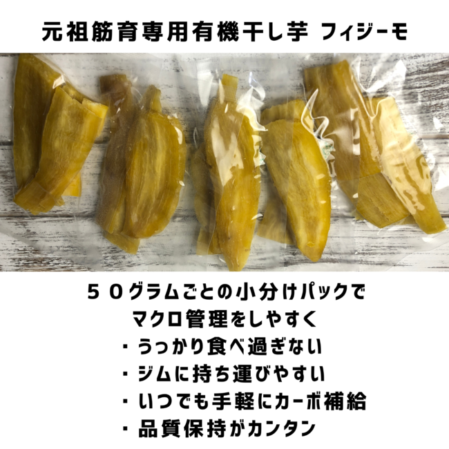 フィジークへの愛(I)とオーガニック干し芋への愛(I)を重ねて、フィジーク専用干し芋「PHYSIIMO(フィジーモ)」と命名しました。また、~PHYSICAL IMPROVEMENT MOTIVATION~肉体を鍛えぬく日々、傍にいつもフィジーモを置いて、癒し・やさしさといった温もりも感じていただき、心のエネルギーにしていただきたいという想いも込められています。