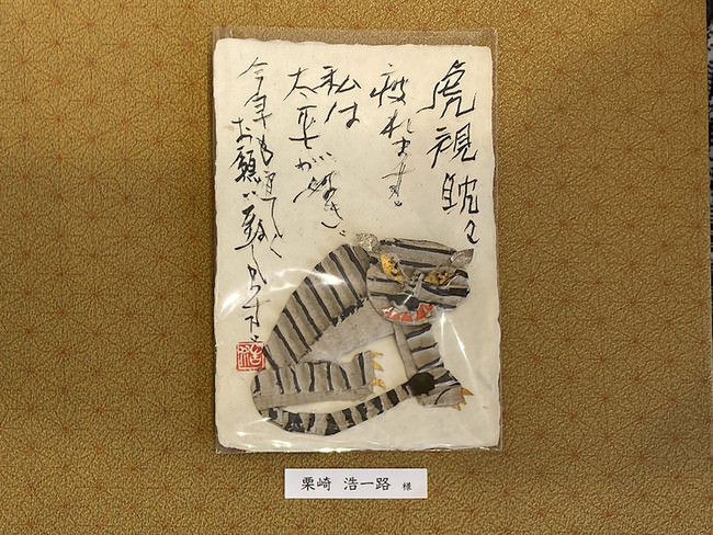 文字や絵で描いた虎や紙を切り貼りし、立体的に仕上げられた作品も。