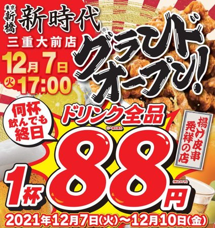 「新時代 三重大前店」のオープンを記念し、ドリンク全品を1杯88円(税込97円)でお楽しみいただけるキャンペーンを開催します。一度、『新時代』にご来店頂ければ、新時代がなぜこんなにも人気なのかを分かって頂けると思います。皆様のご来店お待ち申し上げます。